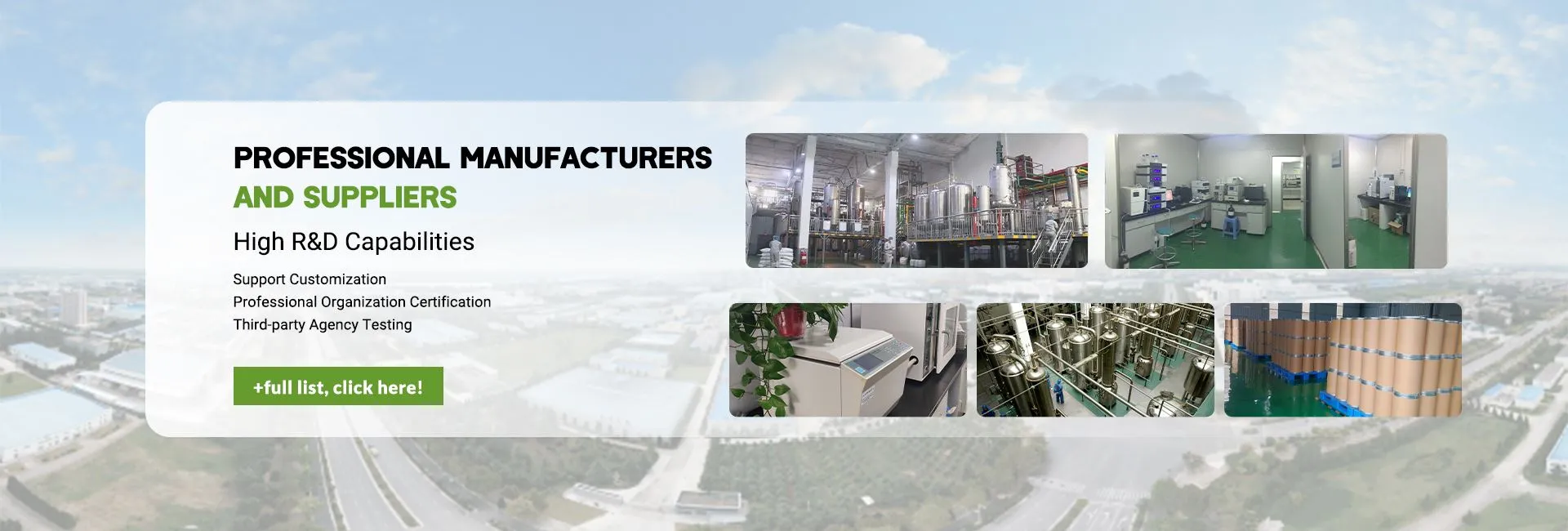 Fruiterco gen yon liy pwodiksyon konplè ekstraksyon, separasyon ak pirifikasyon, ki ka jere plis pase 1,000 tòn matyè premyè epi pwodui plis pase 150 tòn ekstrè estanda ak divès kalite matyè premyè pite. Avèk metòd tès konplè li yo ak mezi strik kontwòl kalite, bon jan kalite pwodwi nou yo ekspòte nan plis pase 100 peyi atravè mond lan, ki gen ladan Etazini, Kanada, Wayòm Ini a, Lafrans, Ostrali, Japon, Kore di Sid, Malezi, Brezil. ak Latiki. Nou gade pou pi devan pou koperasyon!